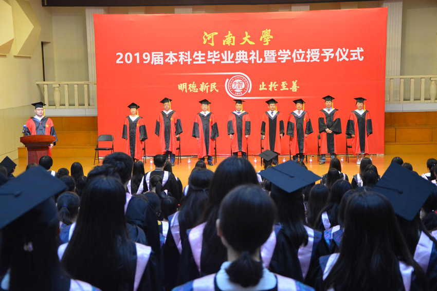 在全体人员奏唱国歌后,武新军宣读了《河南大学文学院2019届本科生学士学位授予决定》,授予罗志南等324名同学学士学位。王宏林为文学院获得学士学位的同学一一援正流苏,授予学位证书,并合影留念。