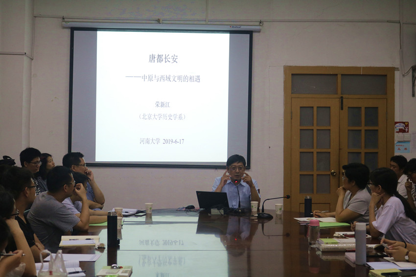 6月17日晚,北京大学历史系暨中国古代史研究中心荣新江教授在历史文化学院三楼报告厅做题为《唐都长安——中原与西域文明的相遇》的学术讲座,讲座由河南大学《史学月刊》编辑部主任、主编苗书梅教授主持。