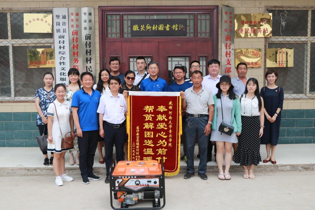 活动开始前,音乐学院党委书记张国强代表学院向前付村捐赠发电机一台,河南大学驻村第一书记、美术学院副院长梁刚代表前付村接受捐赠,村支书夏风成代表村委向音乐学院赠送锦旗表示感谢。随后,梁刚向大家介绍前付村的基本情况,以及当前的重点工作和今后发展规划。张国强表示,做好社会服务工作、助力脱贫攻坚,是河南大学共同的事情,音乐学院义不容辞,今天的捐赠只是一个开始,学院会继续关注支持前付村的发展。音乐学院党委副书记党鸿军就音乐学院暑期党员文化艺术服务团赴前付村进行演出的事宜与相关人员进行了商讨。