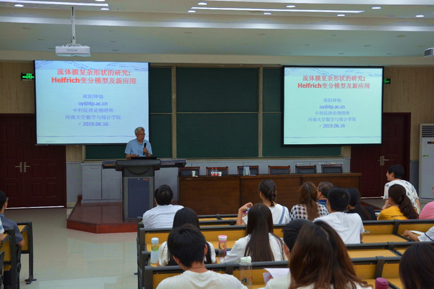 6月16日下午,在数学与统计学院二楼南阶梯教室欧阳院士作了题为“流体膜复杂形状的研究:Helfrich变分模型及新应用”的学术报告。报告会由数学与统计学院院长冯淑霞主持,数学与统计学院,物理与电子学院部分教师、研究生以及本科生参加报告会。