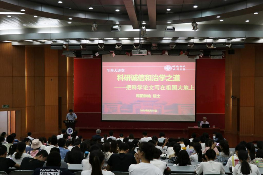 6月18日上午,欧阳钟灿院士做客我校第21期“至善大讲堂”,作了题为《科研诚信和治学之道—把科学论文写在祖国大地上》的报告,报告由研究生院常务副院长苗琛主持。数学与统计学院、研究生院(研工部)及全校各研究生培养单位师生代表近400人聆听报告。
