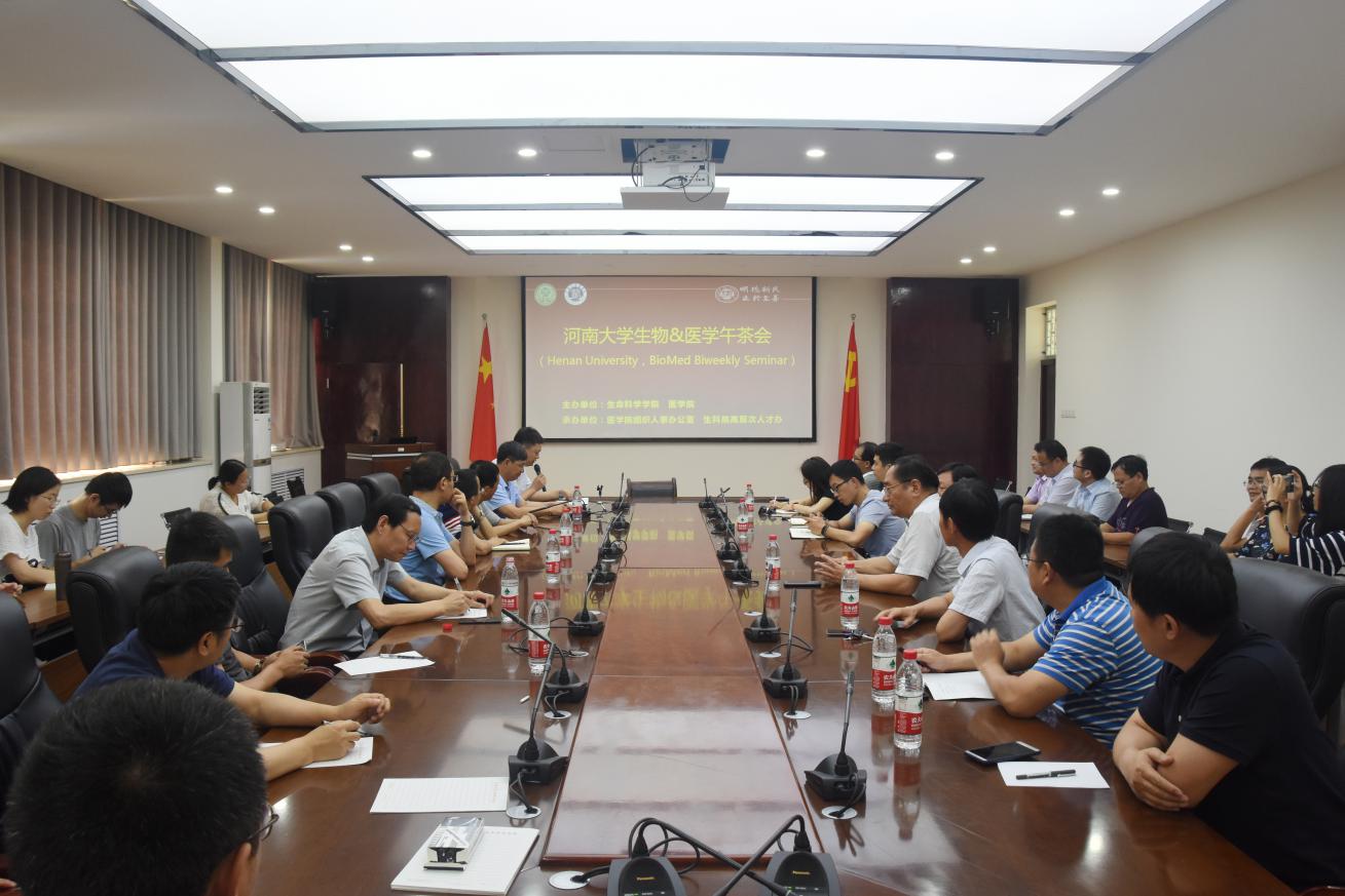 为增进学者友谊,促进学术创新,推进“双一流”建设,6月27日中午,由生命科学学院、医学院联合主办的“河南大学生物·医学午茶会”(Henan University,Biweekly BioMed Seminar,简称“HU-BBS”)在生命科学学院B201学术会议报告厅举行。校党委常委、副校长、医学院党工委书记孙君健出席会议。来自生命科学学院、国家重点实验室和医学院所属学院、实验室的专家学者及各类高层次人才50余人参加会议。会议由生命科学学院党委书记赵东保主持。
