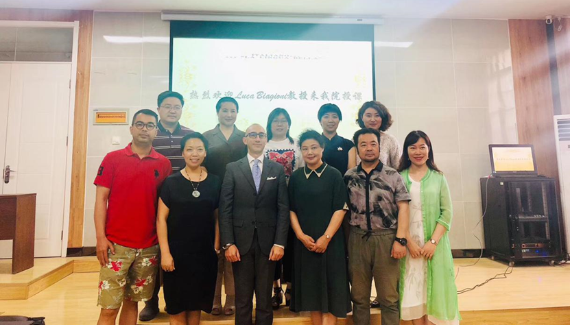 6月10日--6月11日,威尼斯大学教育心理学,东方语言文化硕士学位,北京外国语大学汉语国际教育专业硕士Luca Biagioni(意大利)为音乐学院师生进行了两天的意大利语诵读正音讲座,为师生讲授意大利语发音以及歌唱中的动作与表情等内容。师生热情高涨、认真学习,韩梅、黄慧慧、郑慧玲、冯安君、袁凯、虎翼等教师精心准备了诵读内容,积极与专家交流沟通,和同学们共同学习。6月10日晚,讲座结束后,音乐学院在学术报告厅举办了一场包含意大利语歌词诵读的新型音乐会,夏艺文,夏立,王琦玮,张祯,杨虎霖,孙嘉源,魏泽辉,李瑞,谷裕等同学参与表演,与大家分享了他们的进步。