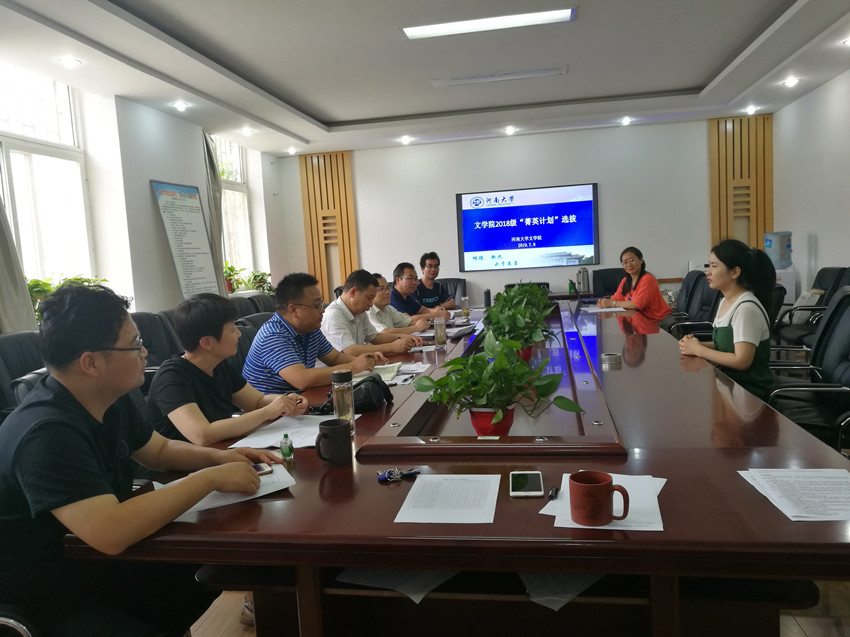 7月8日下午,文学院根据《河南大学本硕一体“菁英计划”工作方案》相关要求,在学院二楼会议室举行2018级“菁英计划”选拔活动。文学院党委书记葛本成,常务副院长王宏林,党委副书记高冬东,副院长白春超、武新军、焦喜峰,导师代表孙彩霞、王银辉等担任评委。选拔活动由武新军主持。