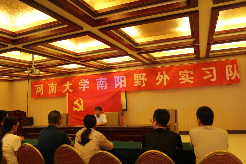 7月6日下午,南阳南召实习队临时党支部在五朵山迎宾馆开展了“牢记初心使命,践行生态文明”的主题党日活动。在鲜红的中国共产党党旗下,党员教师李涛领誓,全体党员重温入党誓词,庄严宣誓,将坚定理想信念的决心,永远保持共产党人顽强拼搏、百折不挠的革命精神。随后,郭廷忠带领大家学习了“不忘初心,牢记使命”的主题教育内容,以及习近平总书记关于生态文明的论述。人与自然是命运共同体,“彼生共此生,彼灭共彼灭”,我们要尊重自然、顺应自然、保护自然,是应牢记于心的使命和为之奋斗一生的事业。