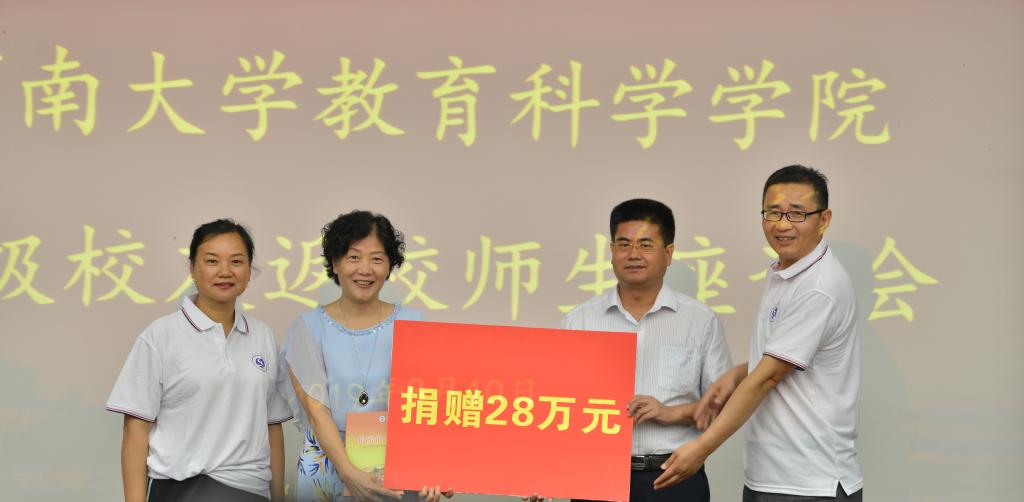 李秀长、杜友莉作为教育系85级校友代表向学校捐赠金额28万元,建立支持学生创新活动的基金,教育基金会主任刘波、教育科学学学院党委书记宋伟代表学校接受了捐赠。师生们在座谈会上共忆往昔的峥嵘岁月,感叹韶华易逝,并互相表达思念与祝愿,动情之处亦潸然泪下。