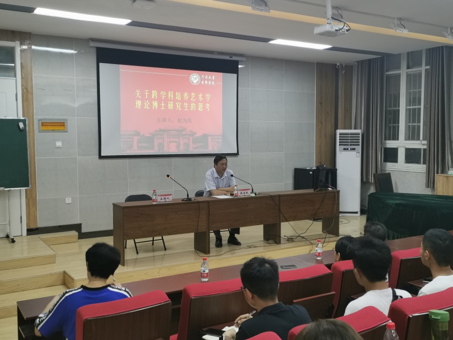 讲座围绕三个方面的问题展开。一是艺术学一级学科博士点的基本情况的分析,赵为民认为河南大学需要建立自己的艺术学理论学科特色。二是结合自身的学术经历探讨如何进行跨学科的学习,突出强调同学们要善于利用综合性大学的学科资源优势。三是研究生问题意识的培养,指导大家如何发现问题。讲座采取边讲授边交流的形式,氛围轻松愉悦。在场研究生踊跃发言,向赵为民请教了关于读书方法、论文选题、学术规划等问题。