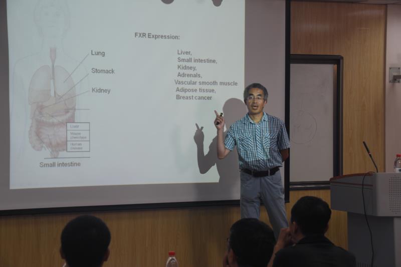 9月6日,河南大学生物&医学午茶会(Henan University,Biweekly BioMed Seminar,简称“HU-BBS”)第六期在基础医学院6楼录播室举行,陈卫东博士应邀做了“FXR,a central metabolic regulator in bile homeostasis as well as lipid and glucose metabolism”和“Bile Acid Receptors in Inflammation and Cancer”的报告。本期午茶会与“河南大学生物医学留学生沙龙”联袂举办,来自基础医学院、生命科学学院、药学院和重点科研机构、附属医院的专家学者和“一带一路”国家的留学生40余人参加会议并进行了深入研讨。