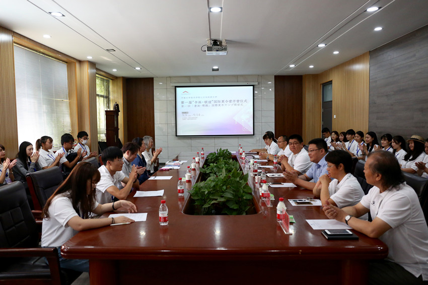 9月9日上午,我校美术学院与日本别府大学联合举办的第一届“书画•联谊”暑期夏令营开营仪式在美术学院一楼会议室举行。校党委常委、副校长孙君健,日本别府大学国际经营学部鈴木晶教授,文学部设计/绘画专业篠崎悠美子教授、甲元隆則教授,国际合作与交流处、美术学院有关负责人及双方学生代表参加开营仪式,仪式由美术学院副院长马利霞主持。