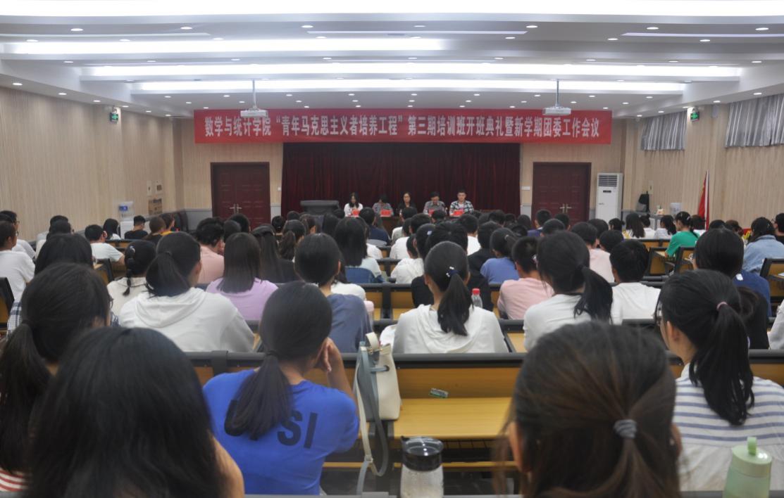 为响应共青团中央《“青年马克思主义者培养工程”实施方案》有关精神和校团委的相关要求,培养具有社会主义核心价值观的优秀大学生骨干,9月29日下午,数学与统计学院于中华人民共和国成立70周年之际举办“礼赞新中国、筑梦新时代”——“青年马克思主义者培养工程”第三期培训班开班典礼暨新学期团委工作会议。校团委、数学与统计学院有关负责人及160余名学员出席开班典礼。典礼由院团委书记吴苏苏主持。