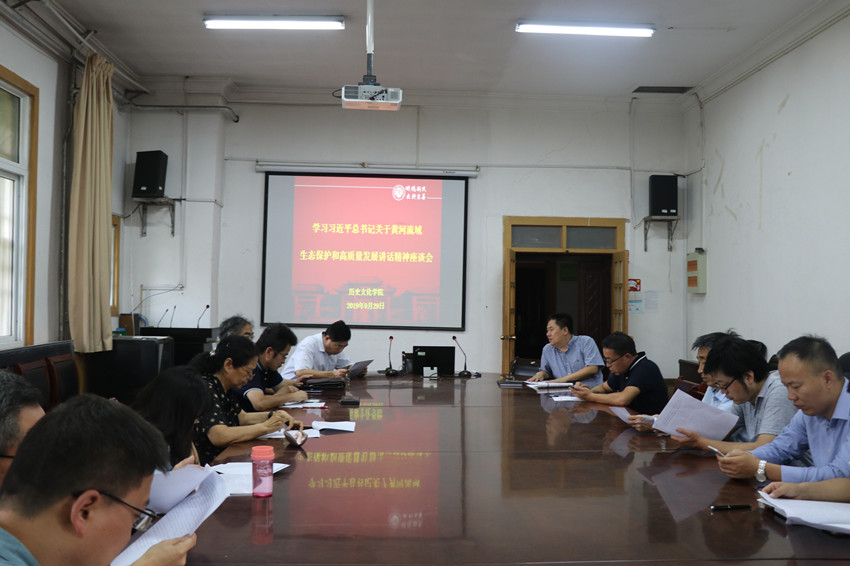 9月29日下午,历史文化学院在三楼会议室召开学习习近平总书记关于黄河流域生态保护和高质量发展讲话精神座谈会。历史文化学院党委书记杨俊中,党委副书记、常务副院长张礼刚,副院长祁琛云及部分教授与会。座谈会由张礼刚主持。