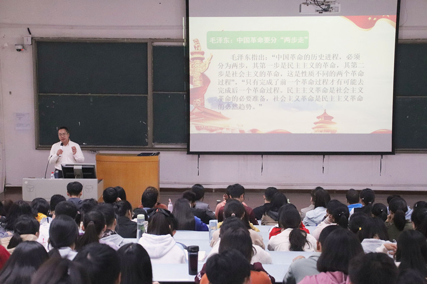 何云峰从中国共产党人的初心和使命切入,从三个不同时代讲述了“为人民谋幸福,为民族谋复兴”的含义,并带领同学们回顾了新中国70年的光辉奋斗历程。第一个时代,毛泽东时代,是社会主义革命和建设时期。他从新民主主义建设、社会主义基本制度建立、全面建设社会主义、“文化大革命”四个阶段,逐层分析,步步深入,以生动有趣的故事,通俗易懂的话语,向同学们阐述新中国成立之初的建设过程。第二个时代,“邓、江、胡时代”,是改革开放和社会主义现代化建设新时期。他从该时期的目标、方法以及道路出发,介绍了中华民族富起来的历史进程。当今习近平时代作为第三个时代,是中国特色社会主义新时代。他以新时代全面从严治党为主要内容,强调新时代是中华民族强起来,实现民族伟大复兴中国梦的重要阶段。