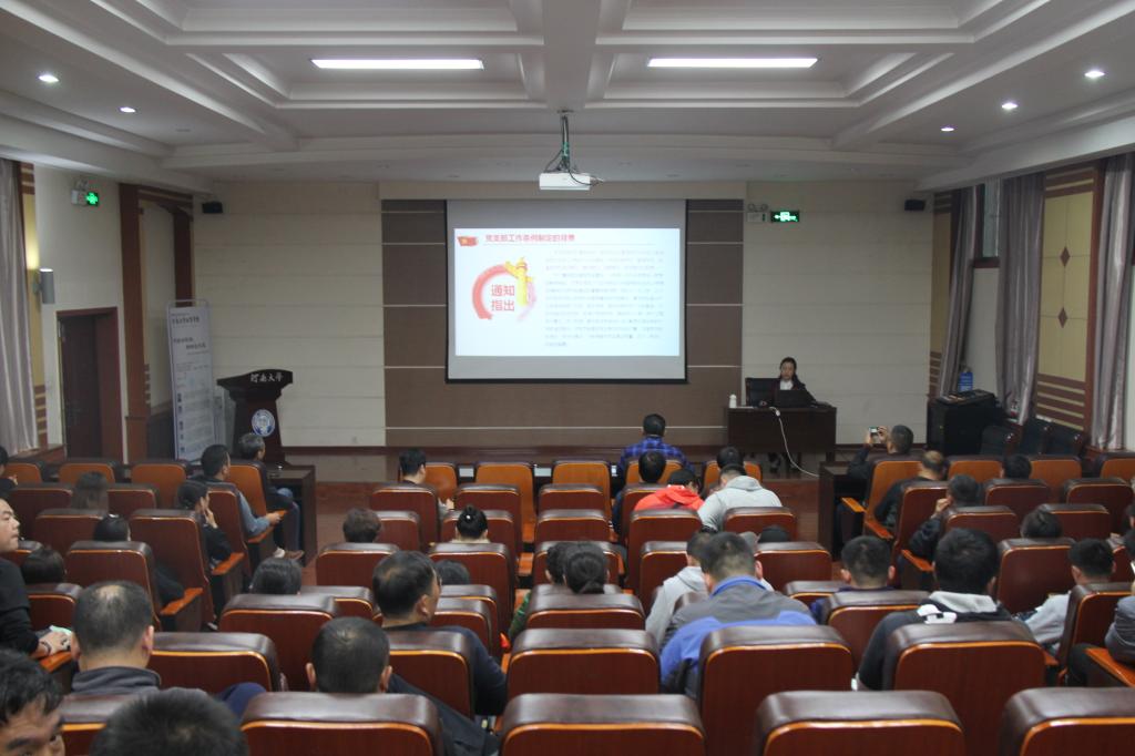 牛娴从党支部工作条例制定的背景、制定工作条例的重要意义、学习工作条例的基本要求、解读工作条例对推进体院基层支部建设的重要作用和贯彻工作条例,强化支部建设的举措思路等五个方面向体育学院全体教职工党员对于《中国共产党支部工作条例(实行)》的文件精神作出详细的解读。