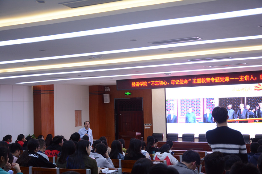 为扎实推进“不忘初心、牢记使命”主题教育活动深入开展,引导广大师生党员提高思想认识、坚定理想信念、发挥先锋模范作用,10月10日晚,经济学院党委书记田歧立在学院二楼报告厅为全体学生党员和学生干部讲授“不忘初心、牢记使命”主题教育专题党课,党课题目是《发扬爱国精神,具备核心素养,争做新时代优秀大学生》。