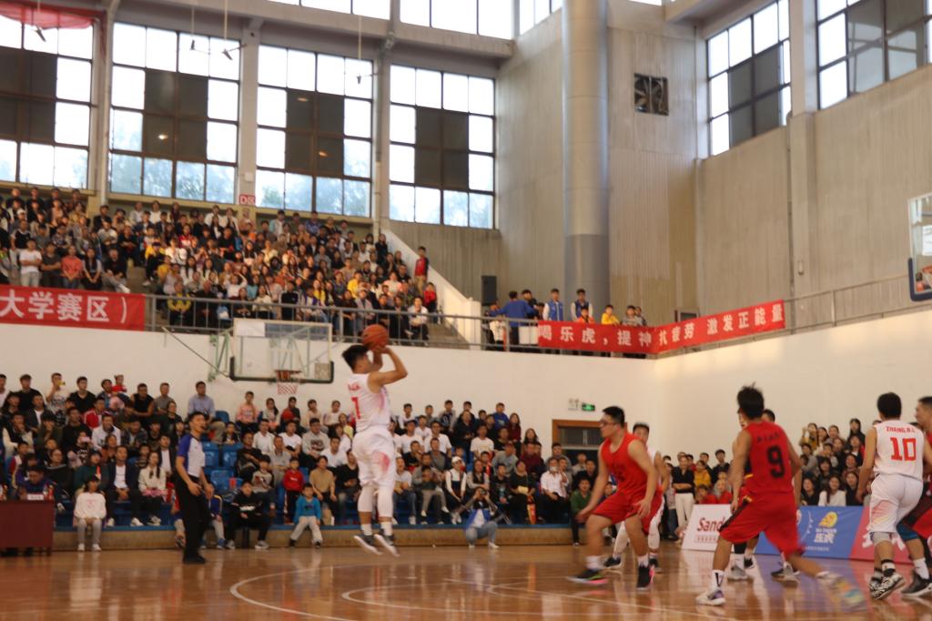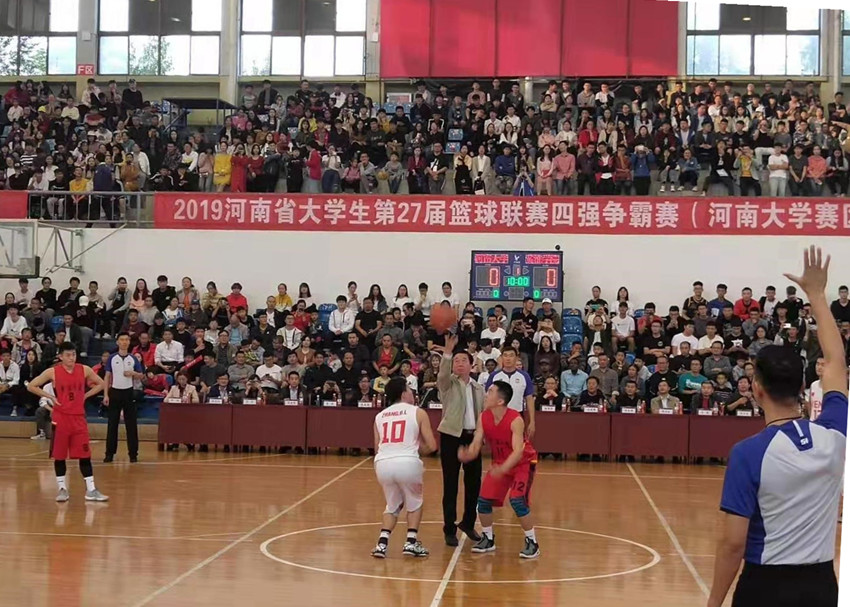 10月13日下午,2019年河南省大学生第27届篮球联赛本科乙组四强争霸赛半决赛——河南大学队vs黄淮学院队的比赛在体育院篮球馆举行。校党委常委、校体委主任、副校长许绍康,河南省学生体育总会篮球协会秘书长丁英俊,河南省校篮办培训部部长、比赛技术代表董胜利,黄淮学院党委副书记杨耀华等,学校各职能部门主要负责人、体育学院领导班子及部分教师出席了本次赛事。
