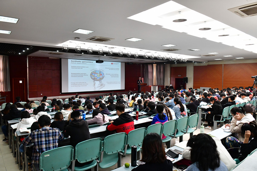 Sakkie Pretorius教授以“Synthetic biology stretching the realms of possibility”为题,从合成生物学的发展历程开始讲起,他在报告中描述合成生物学是一首关于时间进步的循环诗,并且用诙谐幽默的语言为现场的师生细致地讲述了合成生物学从上世纪50年代到今天的发展以及一些趣味历史故事。