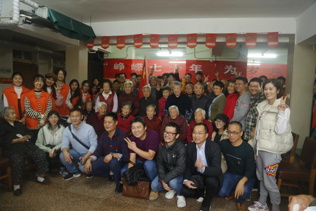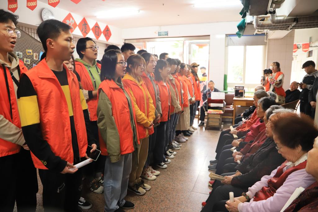感人的一幕发生在师生们的演出结束后。养老中心的“80后合唱团”回赠了师生们一曲《歌唱祖国》。这是由十几位80岁以上的老人组成的合唱团,这些乐天派的老人们自称为“80后”,每位老人都唱得非常投入。师生们也纷纷为他们打拍、伴唱、鼓掌助兴。整场慰问演出就在这样其乐融融的氛围中圆满落幕。演出散场后,师生们又和老人们一起来到养老院中的影壁墙前集体合影留念,然后方和老人们依依惜别,结束了这次有意义的爱心敬老行。