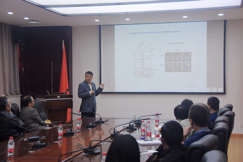 双语报告内容精彩,谈吐幽默,引起了在场博士们的强烈兴趣。来校留学的美国Matthew Khol(中文名“柯梦桐”)博士围绕Parkin蛋白降解通路、自噬通路阻断剂及开发、PD有效治疗策略等问题,用英语与魏博士进行了严肃的学术讨论;生命科学院的王彦明博士、洪军博士、张表博士,医学院的姬新颖教授、吴东栋博士、蒋恩社博士,天然药物与抗体工程实验室的刘绣华教授、岑娟博士,第一附属医院的李东航博士、李延红主任医师,淮河医院的程相树博士等在报告过程中和结束后与魏建设进行了深入交流。魏建设表示,关于脑疾病的发生机制与治疗还有很多亟需解决的问题,希望与大家深入交流和合作,研讨共同感兴趣的科学问题,为生物学、医学学科建设和人类健康发展做出更大的贡献。