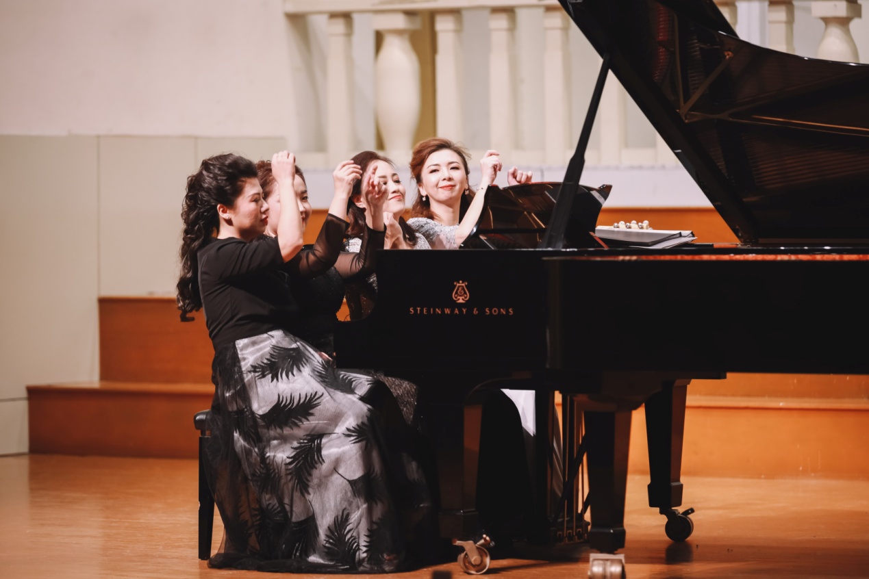 开场曲《费加罗的婚礼》序曲,以双钢琴八手联弹形式演奏。乐曲以其喜剧特有的充满活力的节奏,营造了轻松和愉悦的氛围,拉开了音乐会的序幕。《匈牙利舞曲》、《丝路》、《茉莉花》《命运交响曲》等一首首经典的作品,通过钢琴重奏形式地演奏,带给了观众全新的感受与认识。双钢琴八手联弹作品《野蜂飞舞》在演奏者们精湛的表演下,其极速飞腾而出的音符点燃音乐会气氛,将全场氛围推向至高潮。结尾曲《我的祖国》点明音乐会主题,赞颂了祖国山河之壮丽、国力之富强,更表达了对祖国母亲美好的祝愿。新中国70年峥嵘岁月,我们继续砥砺前行!音乐厅回荡着熟悉悠扬的旋律,音乐会圆满落幕。