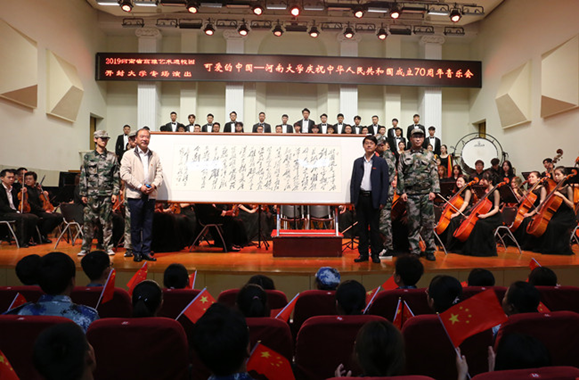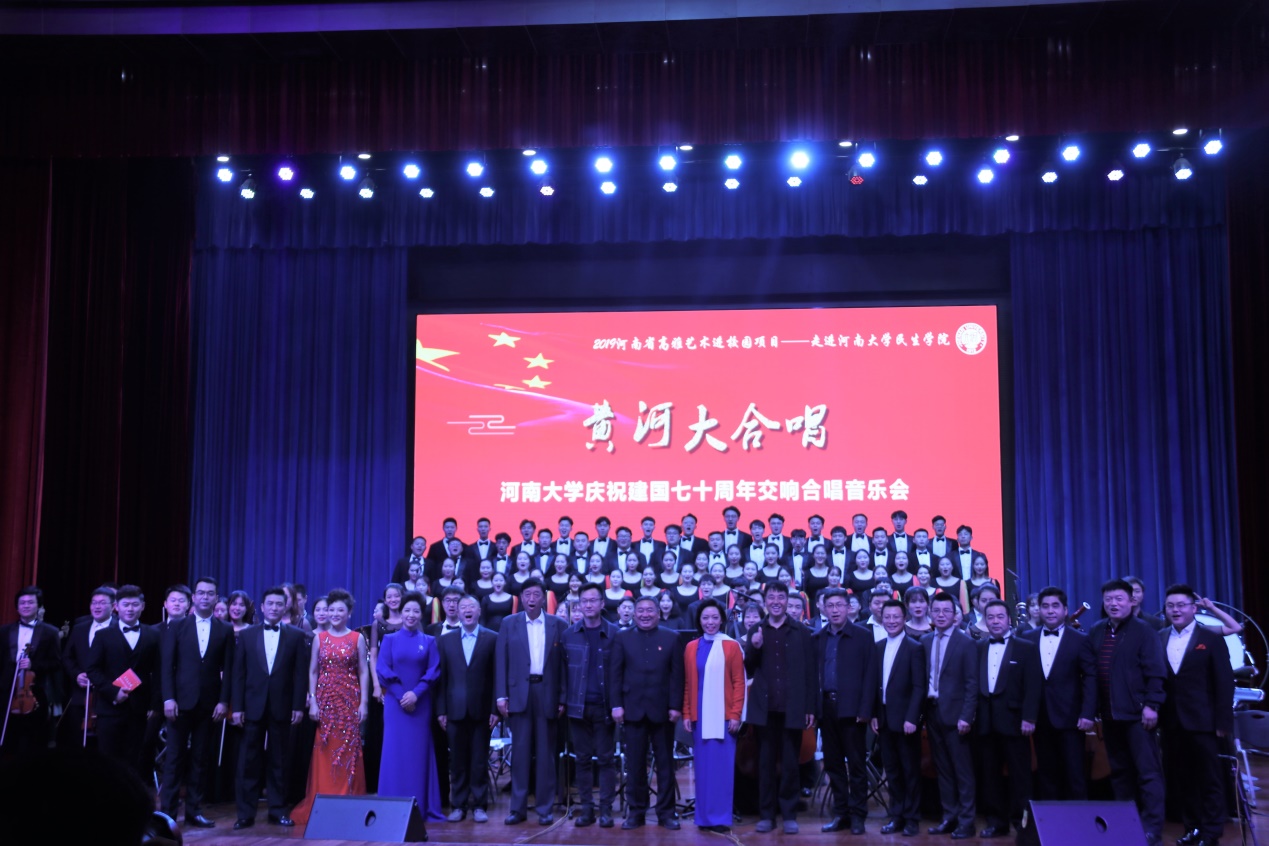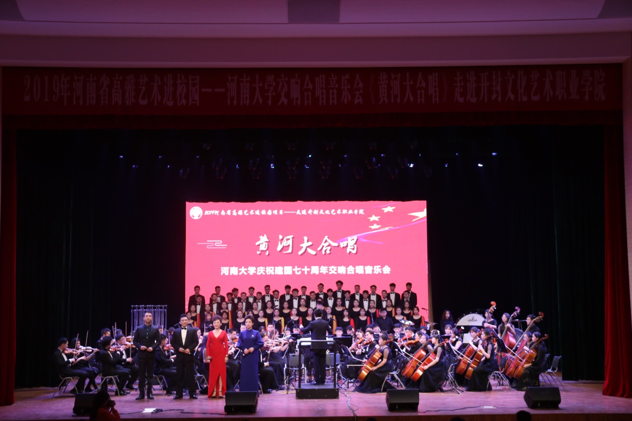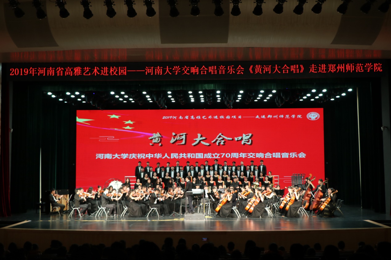 由河南省教育厅、河南省文化与旅游厅、河南省财政厅主办,河南大学音乐学院承办的2019年河南省高雅艺术进校园项目——《黄河大合唱》河南大学庆祝中华人民共和国成立70周年交响合唱音乐会,分别9月19日,10月19日、23日和24日先后走进开封大学、河南大学民生学院、开封文化艺术职业学院、郑州师范学院。相关院校领导老师与学生共同观看了演出,观演人数逾千人次。