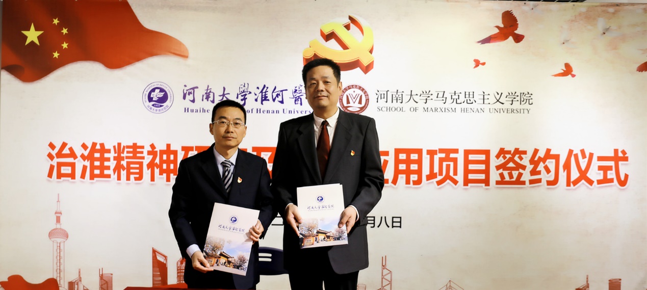 在与会嘉宾的共同见证下,杨光辉和刘志勇代表双方签订了马克思主义学院与淮河医院“治淮精神研究及当代应用项目”合作协议。