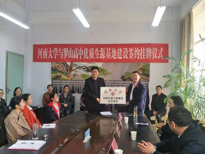崔进军与王桂一行分别同四所中学进行河南大学优质生源工程建设签约暨授牌仪式,面向四所中学展开了招生宣讲,播放我校宣传片《大学之道》,就河大的发展历史、人才培养、国际教育、校园文化、学生发展等方面情况做了详细解读。