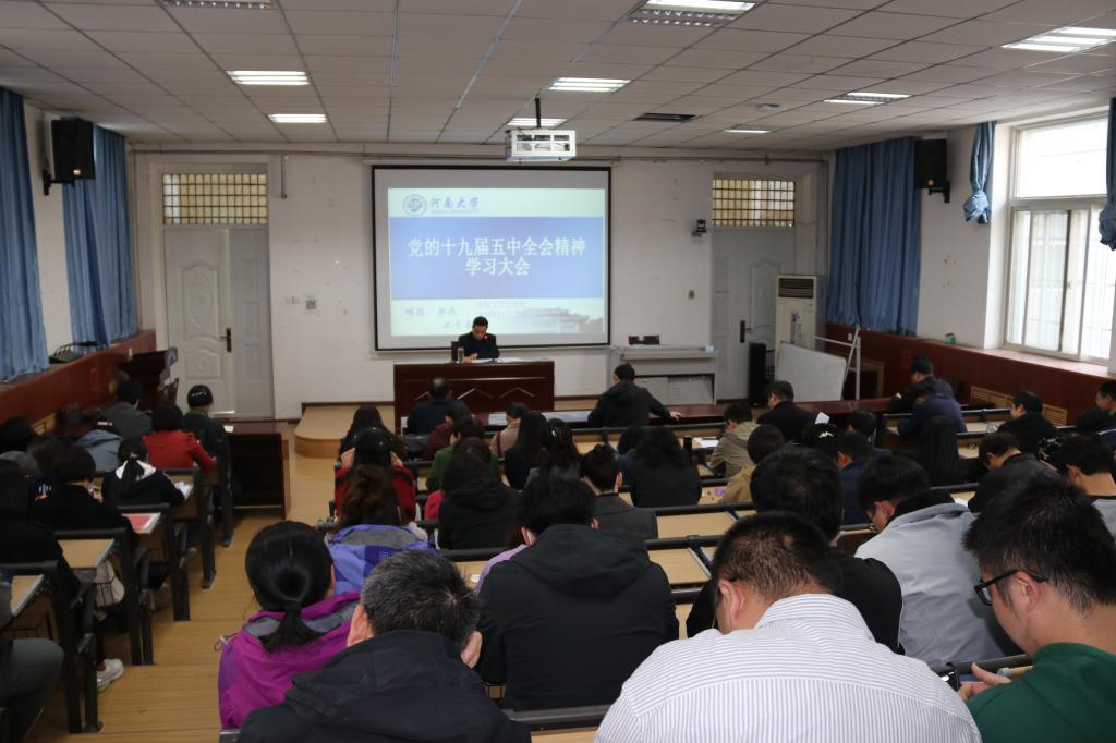 11月12日下午,文学院在学院二楼大教室召开全体教职工大会,传达党的十九届五中全会精神。党委书记葛本成在全院大会上领学了十九届五中全会公报内容,传达了学校党委相关部署,对全院学习宣传贯彻工作进行动员安排。他表示,在“两个一百年”奋斗目标的历史交汇点上,党的十九届五中全会的胜利召开,对国家未来发展具有全局性、历史性的指导意义。“十四五”规划开启了全面建设社会主义现代化国家新征程,二〇三五年远景目标指明了未来的奋斗方向。葛本成强调:学习好、宣传好、贯彻好党的十九届五中全会精神,是学院当前和今后一个时期的一项重大政治任务,全体教师要统一思想,提高站位,切实增强“四个意识”、坚定“四个自信”、做到“两个维护”;希望大家牢记育人初心使命,立足岗位,立德树人,开拓进取,培养一批又一批德才兼备的优秀人才,助力全面建设社会主义现代化国家;学院班子将以学促行,主动作为,不断提高科学谋划水平,积极探索实现高质量发展的有效路径,力推学院在学科建设、科学研究、人才培养等方面的工作再上新台阶。