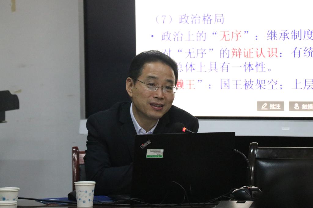 11月12日—13日,华南师范大学副校长、教授、博士生导师、教育部历史学类教学指导委员会委员、中国法国史研究协会副会长陈文海应邀为历史文化学院作法国史学术前沿课程系列讲座,主题包括《史学研习的认识论基准——唯物史观及其基本内涵》、《法国史研习的通史根基——法国通史研究概述》、《现代法国的古代源流——远古至15世纪中叶的法兰西演化之路》以及《中世纪法国的历史书写——以核心历史文献为例》,系列课程以讲座的形式分三场于历史文化学院111教室和三楼会议室举行,分别由历史文化学院院长张礼刚、卢镇副教授以及孙银钢副教授主持。