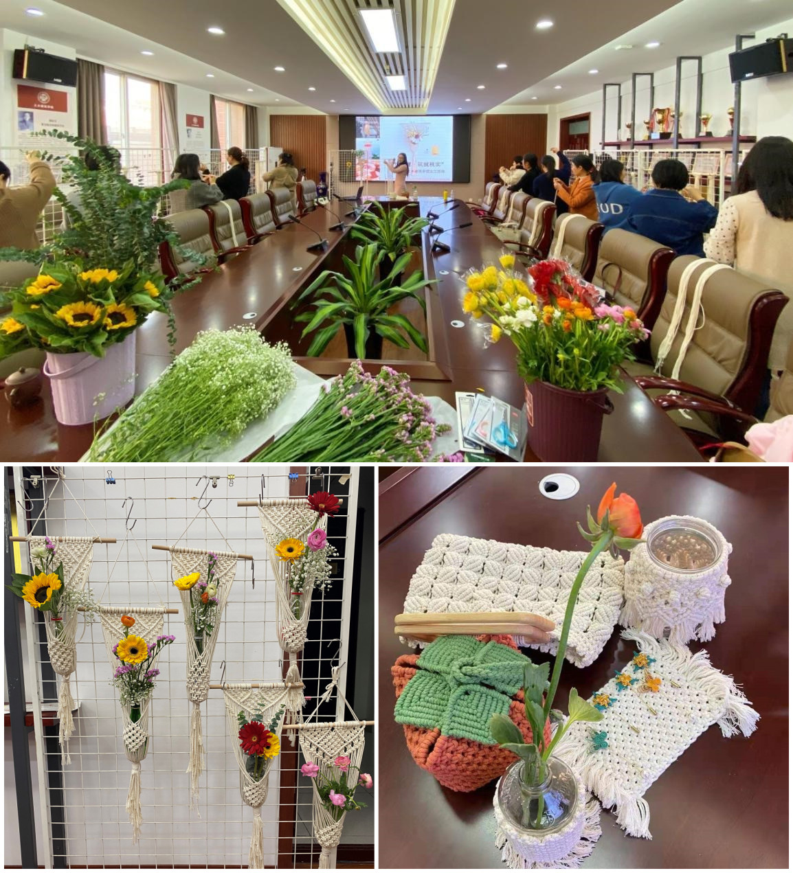 本次编织活动由学院建筑学教师余璐亲自教学,展示并讲解编织材料、编织步骤和编织技巧,活动在大家的欢声笑语中开始。经过余璐的精心传授和耐心教学后,20多名女教工们八仙过海,各显神通,会场不断传来欢笑声和赞叹声,一个多小时后,一幅幅经过构思巧妙的设计编织作品涌现在我们面前。特别是杨卫红、雷雪梅、和冯柯等几位老师的作品收到大家一致好评,充分展现了女教工心灵手巧、热爱生活、追求品质的良好精神风貌。
