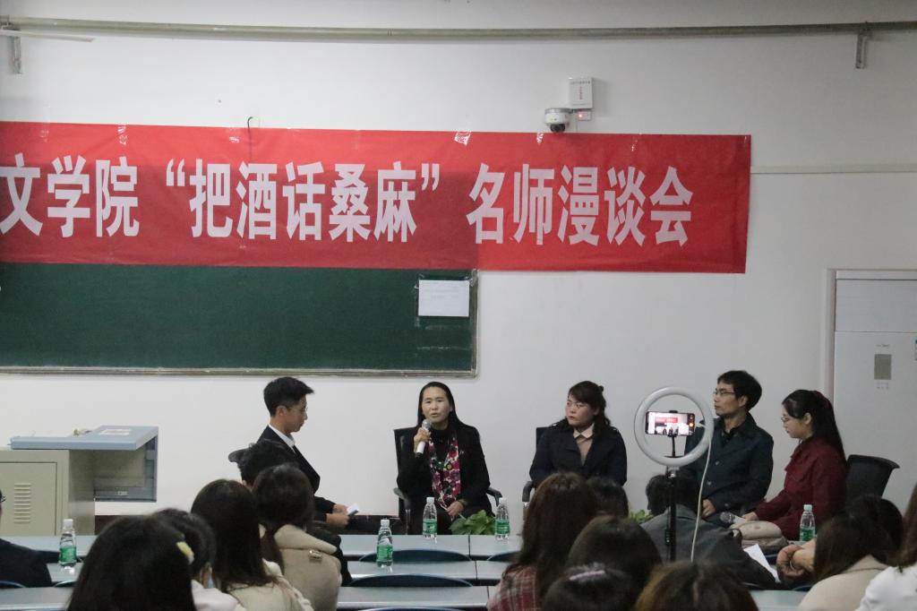 秋菊飘香,群英荟萃。近日,文学院“把酒话桑麻”名师漫谈会于明伦校区十号楼117教室举办。文学院院长王宏林、党委副书记高冬东等相关负责人出席本次活动。语言教研室蔡玉芝老师、文学理论教研室主任王银辉老师和语言学博士鲁冰老师应邀与同学们漫谈大学生活,畅谈学习趣事。