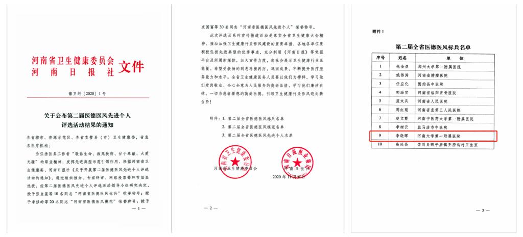 为弘扬医务工作者“敬佑生命、救死扶伤、甘于奉献、大爱无疆”的职业精神,发挥先进典型的示范引领作用,近日,河南省卫生健康委和河南日报社联合通过组织推介、专家评审、网络投票等环节层层选拔,授予10名同志“河南省医德医风标兵”荣誉称号,20名同志“河南省医德医风模范”称号,30名同志“河南省医德医风先进个人”称号。一附院李晓晖荣获“河南省医德医风标兵”称号,也是我市唯一一名此项荣誉获得者。