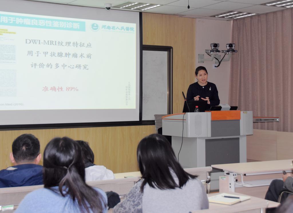 随后,王梅云围绕“影像组学研究进展”、“深度学习研究进展”展开了学术报告,并以省医团队研究成果为例,为与会师生介绍了人工智能技术在临床医学中的应用。面对医学影像任务复杂多样、数据非标孤立、疾病长尾突发等问题,王教授讲述了影像组学(Radiomics)的临床应用,认为影像组学在肿瘤良恶性鉴别诊断、术前淋巴结状态评价等方面都表现突出。王梅云详细介绍了深度学习在医学影像中成功应用的案例。谷歌旗下健康部门Google Health、AI部门Deep Mind联手伦敦帝国理工学院研究部门,使用AI系统对乳腺癌进行筛查,大幅降低钼靶影响的假阳性和假阴性,为开展提高乳腺癌筛查的准确性和效能的临床试验铺平了道路。使用深度学习技术,可以实现视网膜眼底图像上识别、检测糖尿病视网膜病变或糖尿病黄斑水肿,其敏感性和特异性可以达到90.3%和98.1%。斯坦福大学团队利用深度神经网络对皮肤病进行分类,准确率达到72.1%,优于皮肤病专家的65.8%。王梅云团队创建的多模态核磁共振影像组学肿瘤疗效预测方法,能够辅助医生判断局部进展直肠癌患者术后出现远端转移的风险,为患者最佳治疗方案的选择提供了重要依据。该项研究成果发表在Nature子刊《Nature Communications》上。王梅云坦言,人工智能准确率超过人类医生的消息屡见不鲜,但是实际情况很复杂,AI仅是工具,不会完全代替医务工作者的智慧和劳动。报告最后,王梅云提出的医学影像人工智能研究应坚持“来源于临床、服务于临床”理念,为人工智能在医学影像中的应用指明了方向。