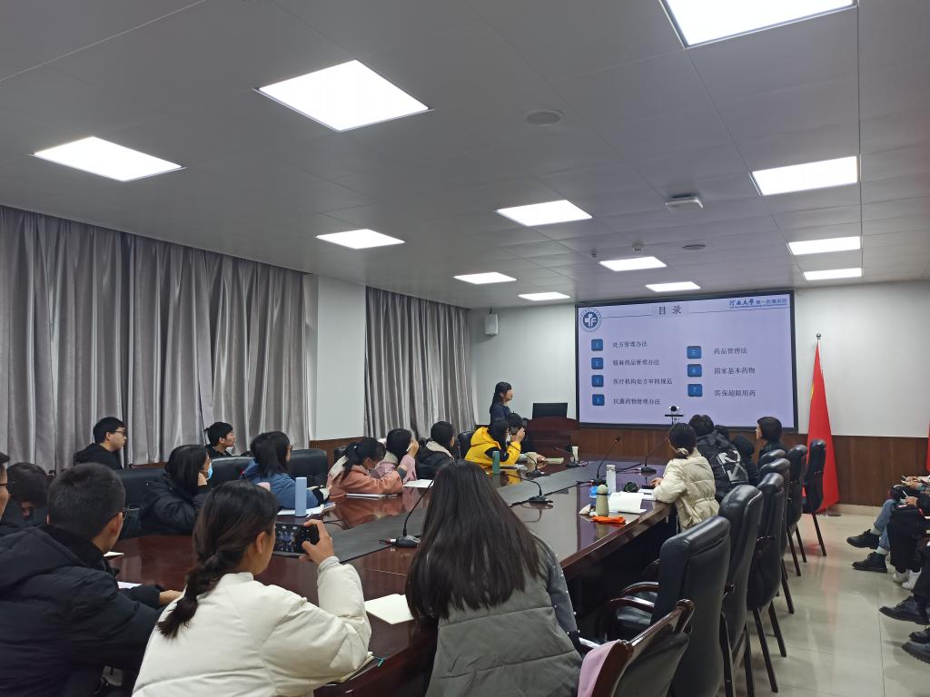 刘蔚详细介绍了一附院药学部的工作职责和工作亮点,向同学们普及了处方管理办法、药品管理法、精麻药品管理办法、国家基本药物、医疗机构处方审核规范、医保超限用药、抗菌药物管理办法等内容。并对药学专业学生的就业方向和发展前景做了简要说明。