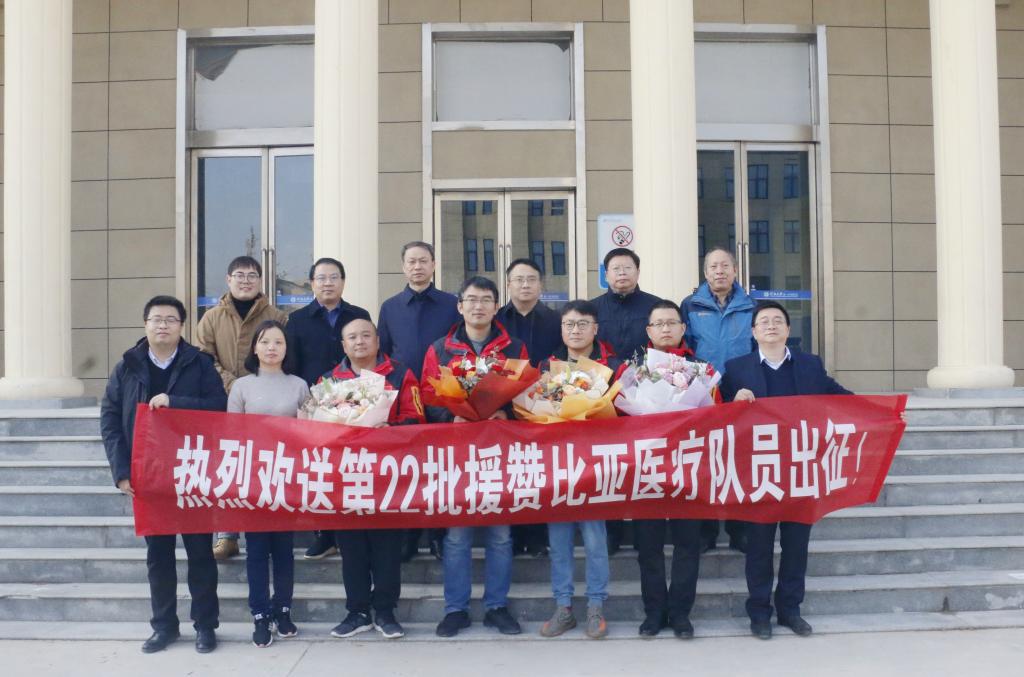 11月24日,在康复大厅前,声声叮咛、句句嘱托,一附院欢送参加中国援赞比亚第22批医疗队的4名医疗队员——影像中心尹晓翔、口腔科任春富、消化病科郭二涛、麻醉与围术期医学科韩宏亮。