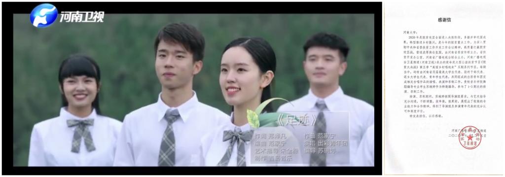 河南卫视在感谢信中写到:“在录制拍摄期间,朱全稳与导演商讨排演方案,提出了诸多建设性意见,专业、认真、敬业,展现出了极高的专业素养和协作精神。”“苏婉婷按照导演组要求,与艺术指导充分沟通,不断调整,效率高,效果好,展现出了较高的专业能力和合作精神。”这是既是对两位同学在录制节目期间表现的高度评价,也是对我院人才培养质量的肯定。两位同学运用专业所学,积极投身国家扶贫工作,用艺术的方式助力脱贫攻坚宣传教育,不仅展现了我院学子的良好素养,也体现出了新时代大学生的责任担当,希望其他同学向他们学习,学好专业本领、提升实践能力,将自己的成长与祖国的成长联系在一起,在服务社会服务人民的过程中实现自己的个人价值。