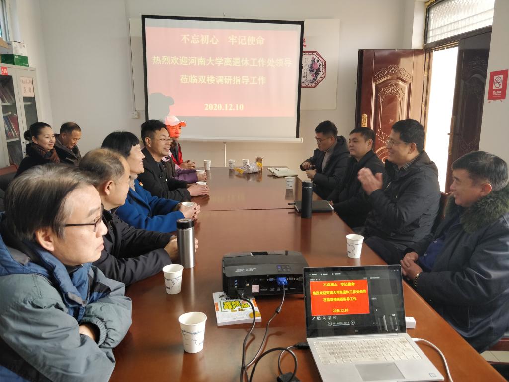 座谈会上,双楼村党支部书记李荣昌对我校离退休工作处一行的到来表示热烈欢迎和由衷感谢,简要介绍了双楼村的基本情况。河南大学驻双楼村工作队队长车颍涛就打赢脱贫攻坚收官战的做法和成效做了说明。他表示,工作队驻村以来,多次召开党员群众座谈会并实地走访调查,精确查找村民生产生活中存在的问题,针对问题采用科学合理方法进行解决,他详细介绍了河南大学幼儿园与双楼学校结对帮扶、双楼村人居环境提升工程、卫生村创建等方面工作,他希望离退休工作处持续大力支持双楼村工作,为双楼村发展建言献策。
