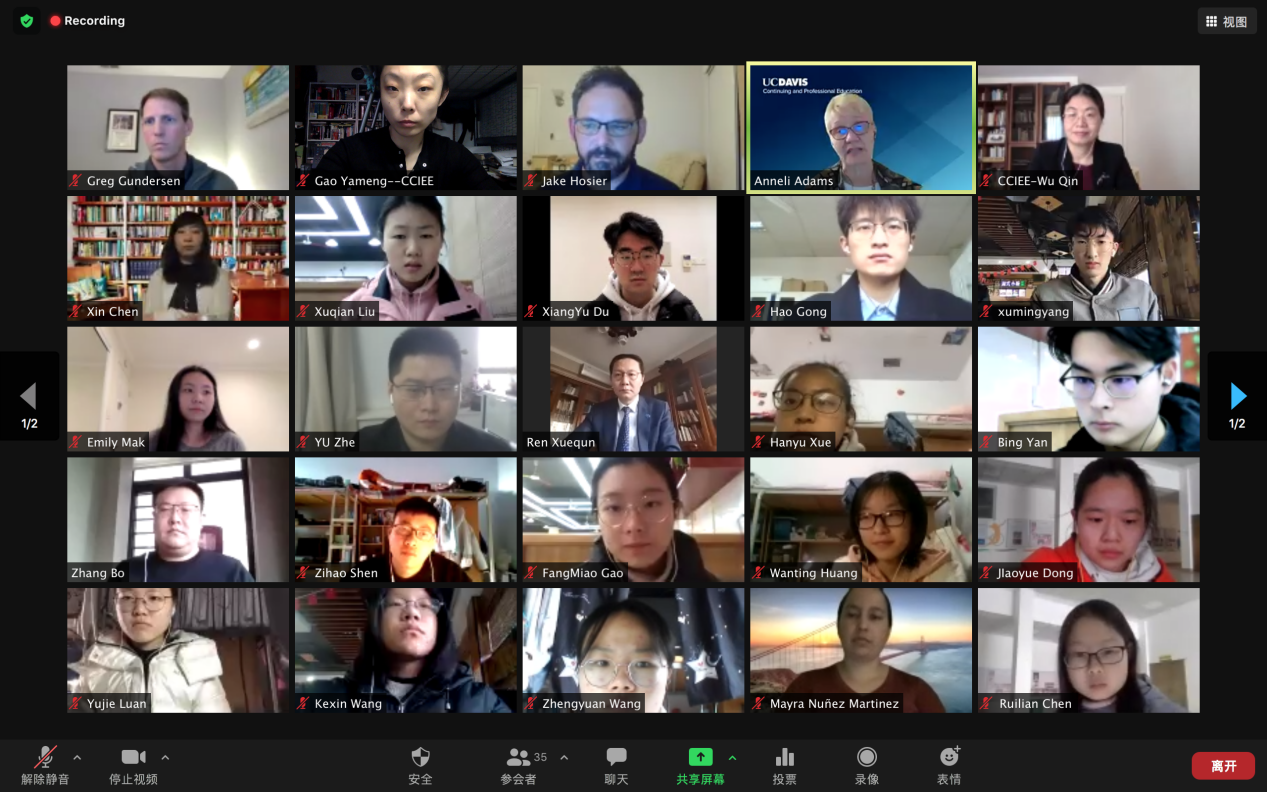12月13日上午,医学院“University of California,Davis”线上学分课程圆满收官。美国加州大学戴维斯分校(University of California,Davis UCD)国际教育学院副院长、国际教育项目负责人Anneli Adams,加州大学戴维斯分校国际教育学院国际继续教育与专业教育高级留学生顾问Greg Gundersen及相关任课教师,国际合作与交流处副处长张波,医学院常务副院长任学群,医学院党委副书记王莹,医学院副院长姬新颖,临床医学院院长、淮河医院院长张祎捷,医学院国际合作与交流办公室主任石贞玉及课程相关负责人应邀出席本次结课汇报。本次结课汇报由UCD和河南大学双方共同主持。