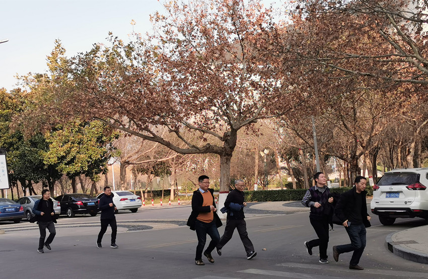 下午2:30,全体老师在学院门口集体拍照留念。随后,第一个项目环校慢跑正式开始,从学院门口出发,教师们围绕金明校区主干道,向终点奔跑,一路上有学生志愿者摇旗助威。教师们在阳光下挥洒汗水的场景,不仅展现了激情活力的一面,更体现了他们对生活的热情。