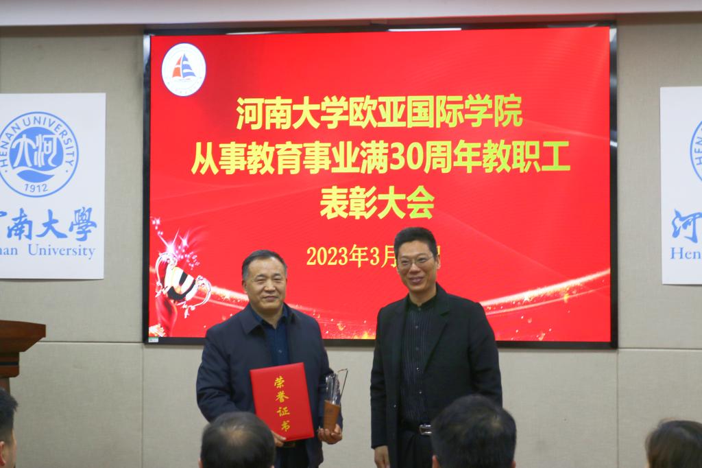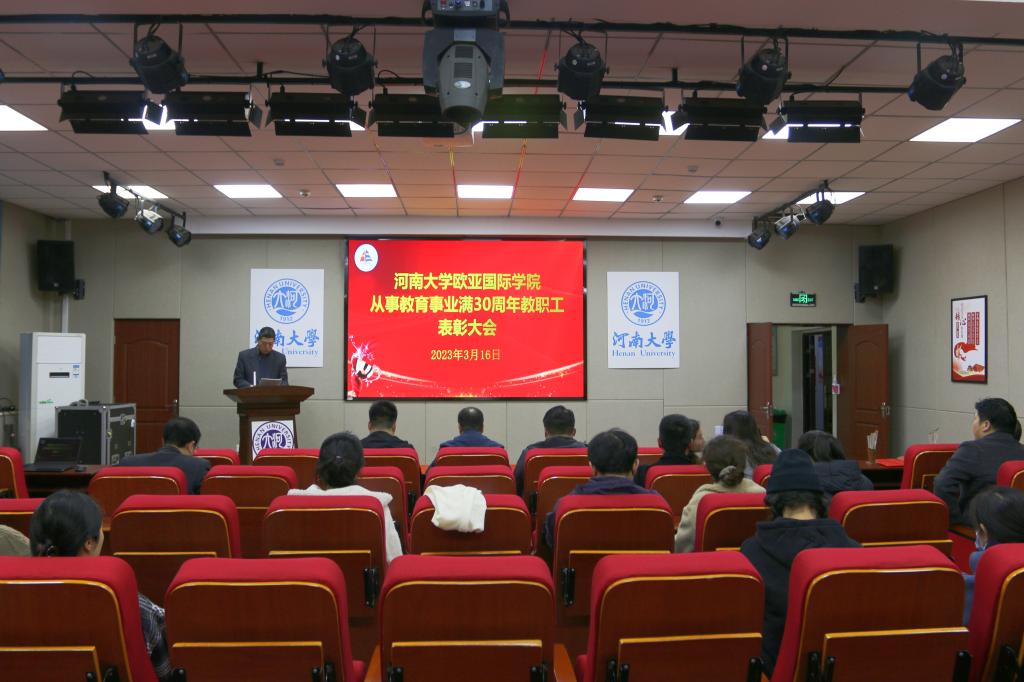 为表彰长期从事教育事业,为河南大学与欧亚国际学院发展作出积极贡献的教职工,3月16日下午,欧亚国际学院从事教育事业满30周年教职工表彰大会在学院二楼报告厅举行。学院全体教职工参加了大会。副院长苏芳芳主持会议。