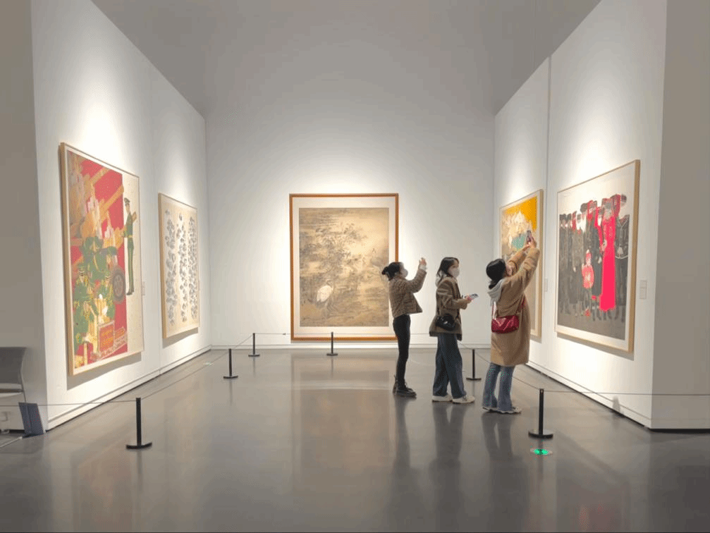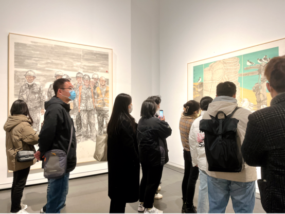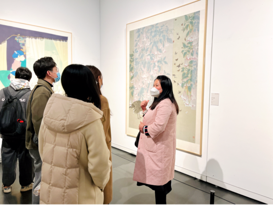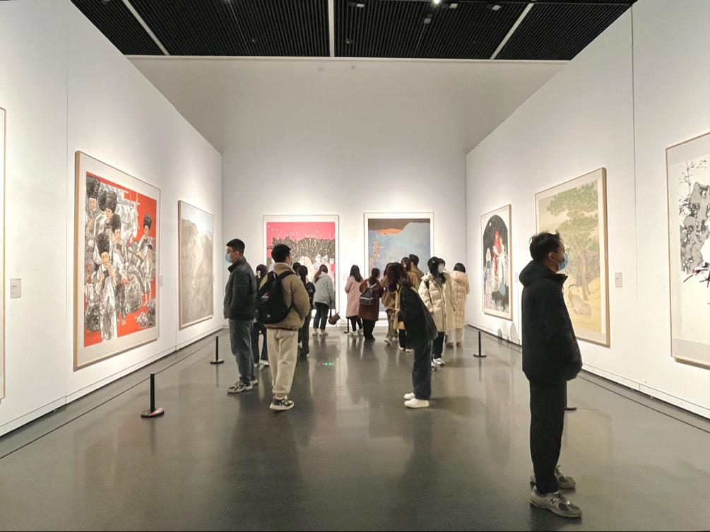 师生们在参展过程中细细欣赏、慢慢品味,时而驻足静观、时而热烈讨论,大家透过这些作品清晰地看到中国画在新的时代感召下,发生的新变化、新格局与新面貌。展览中有许多作品从形式、题材、手法等诸多方面展现出了探索与突破,画家们深入人民、亲近自然、扎根生活,用不同的创作方式为时代讴歌、为人民礼赞。在陈列的作品中,不同题材的作品着眼点各异,既有观察民生、反映生活,充满了人情与烟火气的现实创作,也有回望经典、融合新意,充满艺术性与思想性的时代佳作。创作者虽不乏实力名家,但更多有青年翘楚,体现了传统进入当代的转变,也展现了中国画鲜活的生命力,更使学子们深切感受到了当下开放、包容、良好的创作环境。