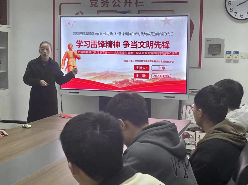 为大力弘扬雷锋精神,培育“奉献、友爱、互助、进步”的志愿服务精神,3月18日,物理与电子学院本科生通信工程党支部全体党员在党支部书记张婷老师的带领下开展了学雷锋主题党日活动。