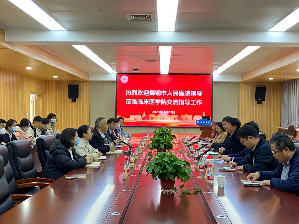 3月23日上午,平顶山舞钢市人民医院党总支书记杨星奎、院长郭文伟一行7人,到临床医学院考察交流。临床医学院党委书记谢纳泽、学院有关科室负责人,在曾宪梓楼二楼学院学术报告厅热情接待了客人。