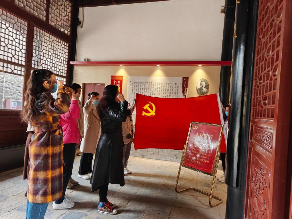 随后,一行人参观了刘青霞故居。故居无言,历史有声。在这里,每一处地方,每一件物品,都默默地诉说着这位巾帼女杰动人心魄的一生。她也正是从这里起步,牢固树立了国家兴亡匹夫有责的思想,走上了匡救国家危亡的道路。“巾帼英雄,天下为公”不仅是孙中山先生的敬佩,更是广大人民群众对她的赞誉。参观中,同学们无不被革命先烈胸怀天下的精神所感动。在故居中的辛亥革命纪念展厅,支部书记梁红霞带领全体党员重温入党誓词,对党旗宣誓,承诺将传承红色基因,继承先辈遗志,传承先人理想,勇于探索、积极奉献,为新时代的发展贡献自己的力量。