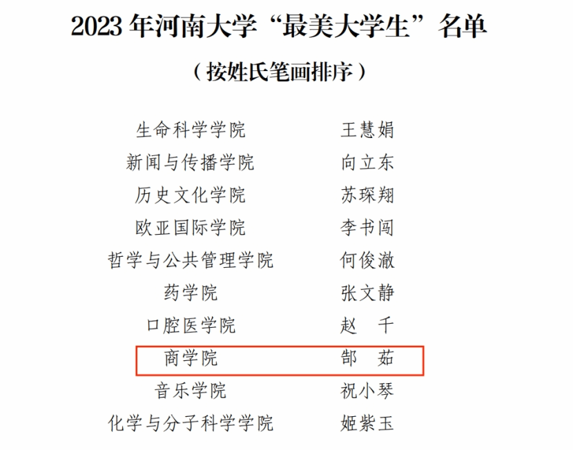 3月27日下午,河南大学党委学生工作部下发了《关于表彰 2023 年河南大学“最美大学生”的决定》(校党学〔2023〕5 号),经学院推荐、组织初评和现场答辩复评并公示,商学院2019级物流管理专业学生郜茹获评2023年河南大学“最美大学生”荣誉称号。