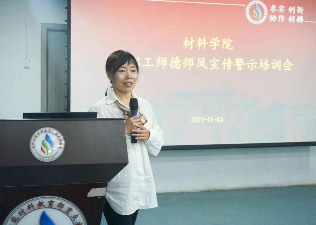 为切实加强师德师风建设,引导教职工坚定理想信念、潜心教书育人,树立良好师德形象,11月3日下午,材料学院在负一楼会议室举办了师德师风宣传警示培训会,校党委教师工作部副部长赵炎应邀作专题讲座。会议由学院党委副书记石宇珺主持。