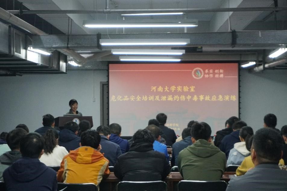 为切实加强实验室安全管理,进一步落实《生产安全事故应急预案管理办法》关于应急演练的具体要求,努力营造和谐稳定的科研环境,推动学院实验室安全文化建设,不断增强师生安全意识,提高实验室安全防护与应急能力,11月6日下午,材料学院开展了实验室危化品安全培训及泄漏灼伤中毒事故应急演练,实验室安全员40余人参与此次活动。实验室与设备管理处副处长阎朝坤、实验室安全科贾文慧受邀参加,会议由学院副院长刘谨主持。