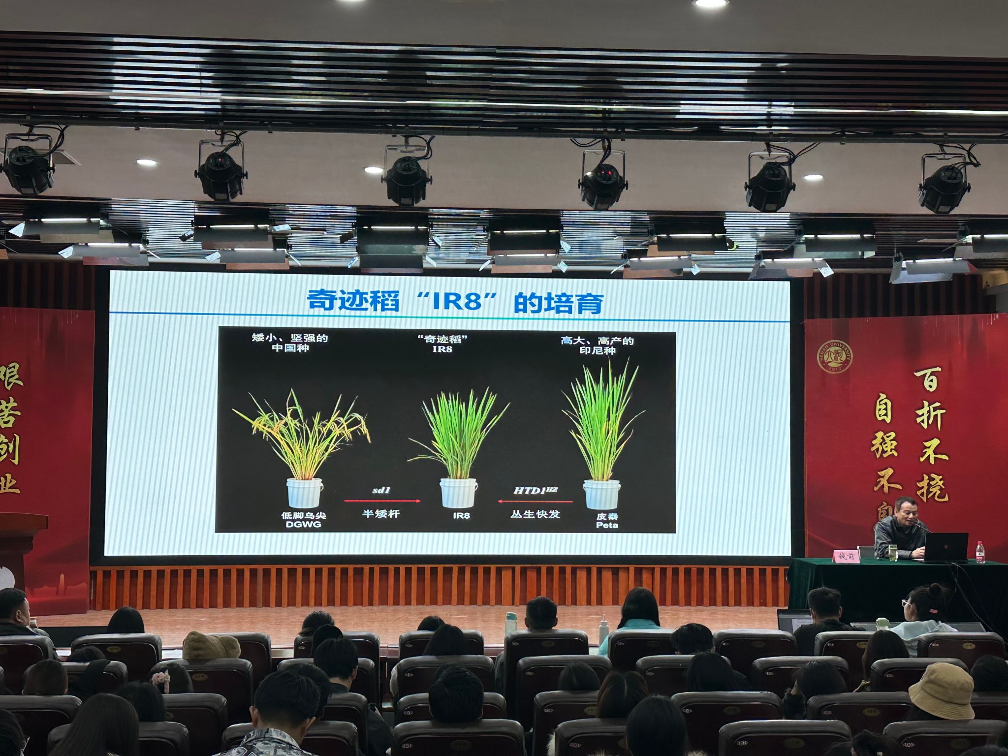 钱前院士以籼型杂交水稻问世距今恰逢50周年为引,以三次“绿色革命”时间轴回顾了杂交水稻的研究历程。水稻乃“国之重器”,是增加国家粮食产量、消除国家粮食问题、保障国家粮食安全的制胜法宝。他指出,我国水稻高产育种能力已位居世界领先地位,得益于袁隆平院士、张先程教授等一大批科学家前赴后继,在世界范围内掀起杂交水稻研究热潮,为中国人彻底解决饥饿的同时也为世界粮食增产作出了巨大贡献。钱前院士始终保持着水稻育种的浓厚兴趣,通过讲述自己的成长历程、求学经历,勉励当代青年学生要始终坚信“天生我材必有用”,做到“知其然,知其所以然”,继承和弘扬科学家精神,在实践中不断积累,敢想敢干、守正创新。