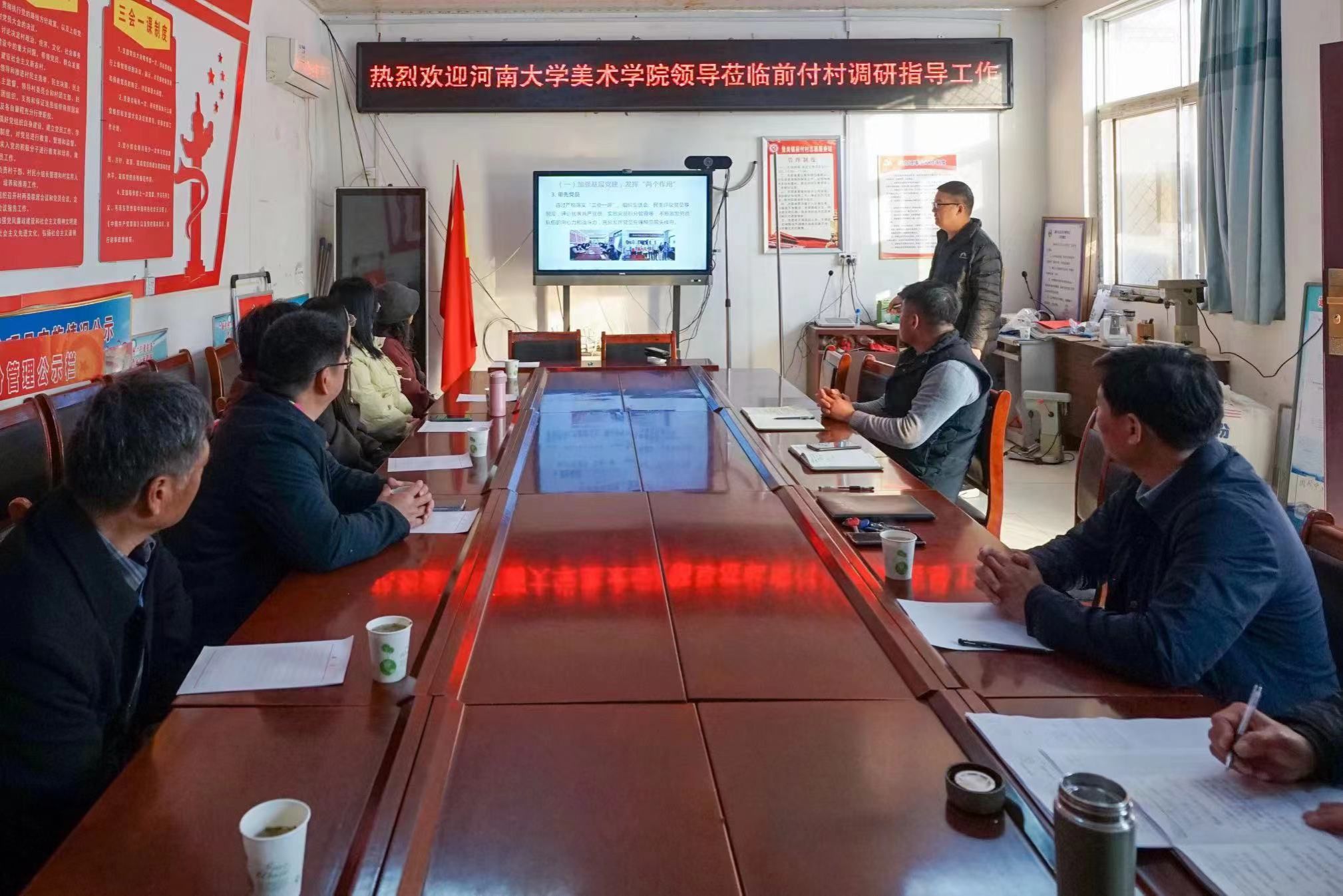 杨江涛对驻村工作队开展的帮扶工作和取得的成绩给予充分肯定。他表示,驻村帮扶是一项政治任务,大家必须认识到责任重大,使命光荣。自2017年以来,河南大学选派了一批又一批德才兼备、能力突出的同志走到驻村工作岗位上来,他们带着全体河大人的殷殷期盼,在平凡的岗位上展示着责任与担当,在乡村振兴的大舞台上建功立业。美术学院一直以来全力支持、有力保障驻村工作,今后将一如既往地加强与前付村的联系,从墙绘、艺术支教、消费助农、环境设计优化等方面开展务实合作,发挥好专业优势,为美丽乡村建设贡献一份力量。参加活动的党员教师纷纷表示,要以此次党日活动为契机,向驻村工作队学习,增强主人翁意识,不怕吃苦,甘于奉献,以更加昂扬的精神状态和奋斗姿态,做好本职工作,助力学校“双一流”建设。