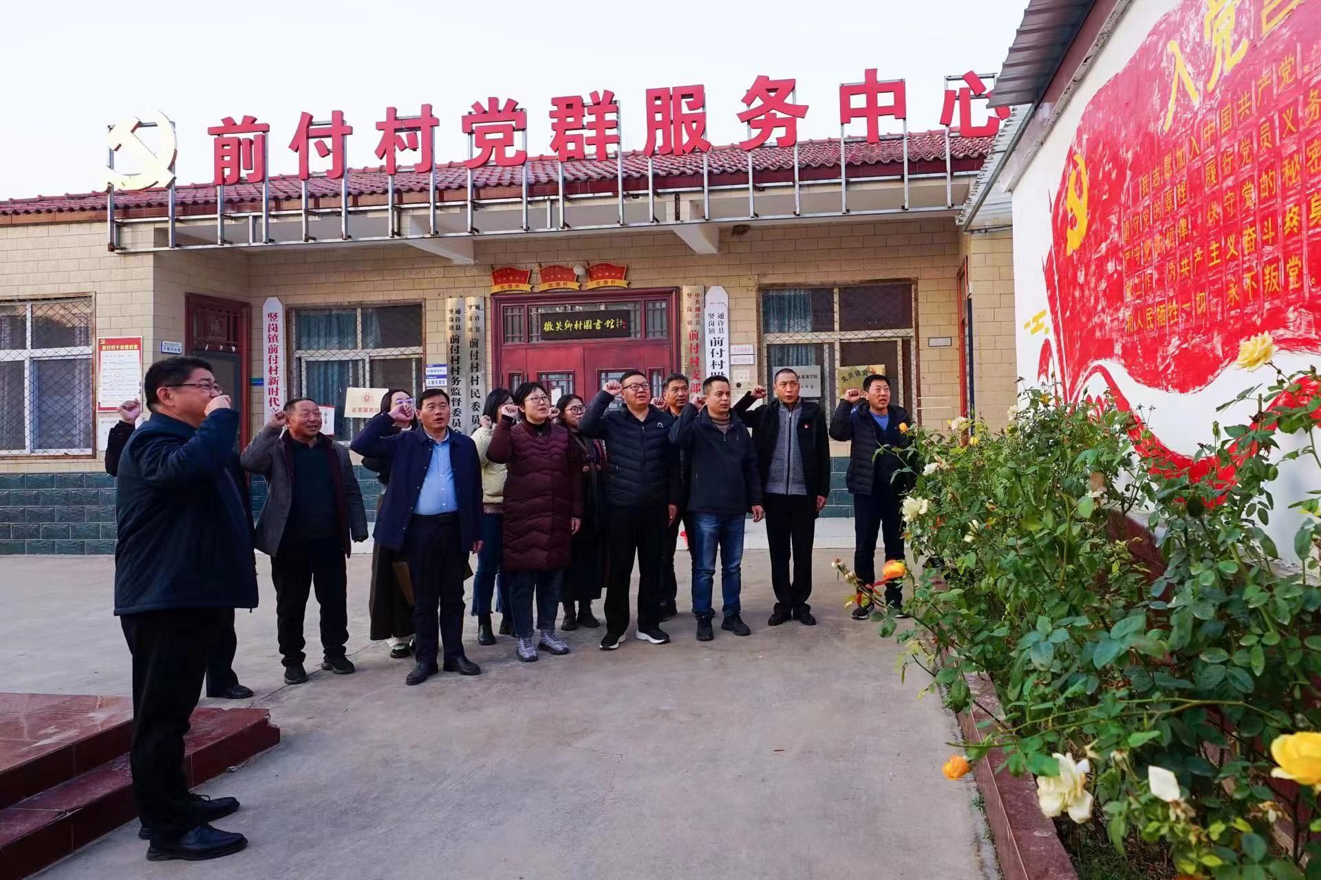 座谈会后,杨江涛一行参观了前付村新建的党群服务中心,沿路欣赏了美术学院志愿者的墙绘作品,并就宜居环境改善交流了意见。美术学院教工党支部和前付村党支部党员重温入党誓词,并合影留念。