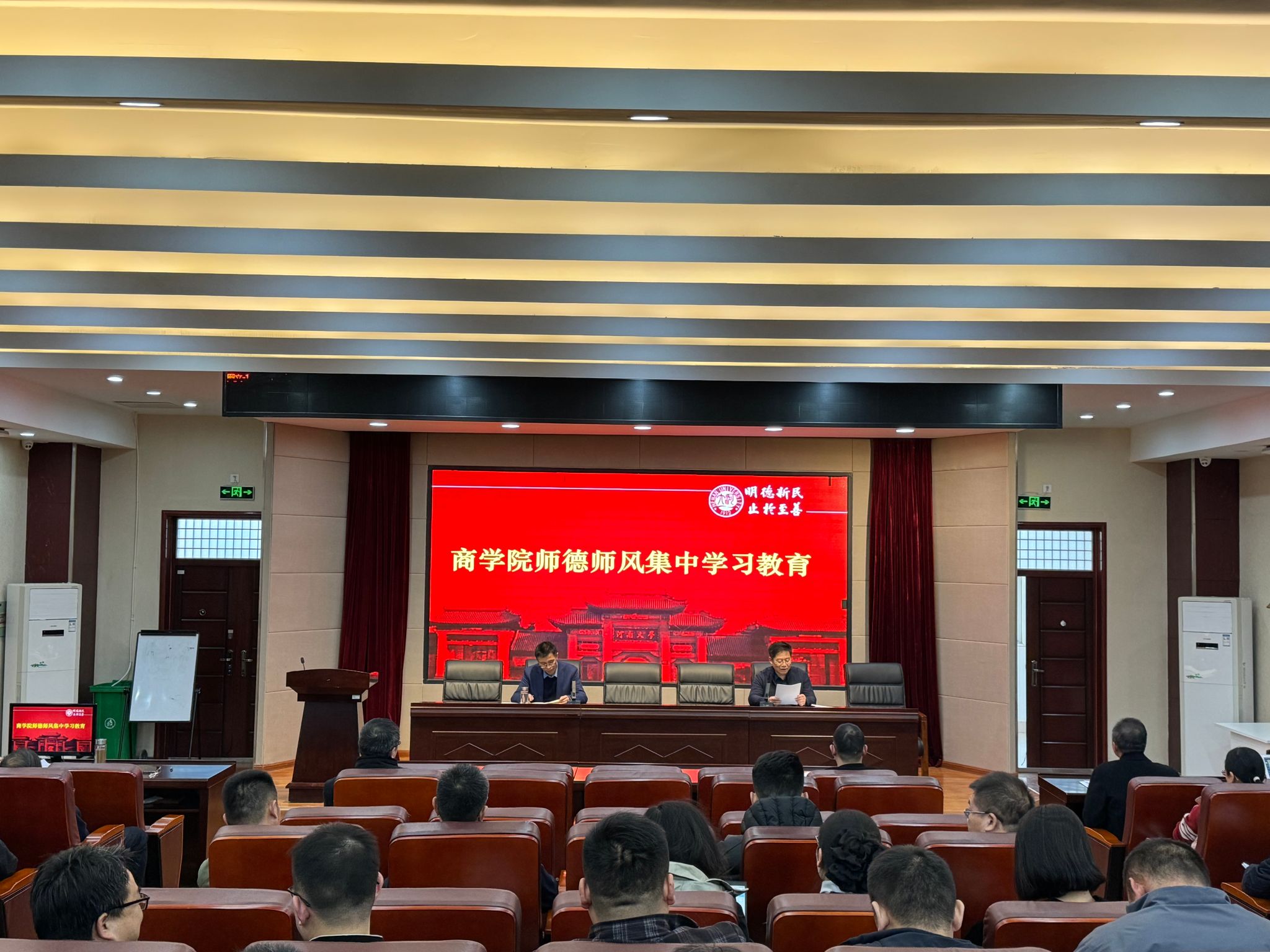 9月14日,商学院面向全体教职工召开师德师风学习会,会上院党委书记左辞波结合教育部、国家自然科学基金委、各省份教育主管部门公开曝光的违反教师职业行为十项准则典型案例为反面教材,引导学院教师以案为鉴、以案明纪、以学促改。会后全体教职工共同学习《师德承诺书》内容并庄重签下了自己的名字,进一步促进学院教师信守师德规范,履行师德的承诺。